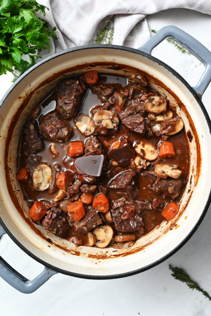 - Large pot: A Dutch oven works the best when making this red wine beef stew, but you can use a regular large pot too. Just make sure that the pot you use is big enough to hold all of the ingredients comfortably for even cooking and no spilling over.