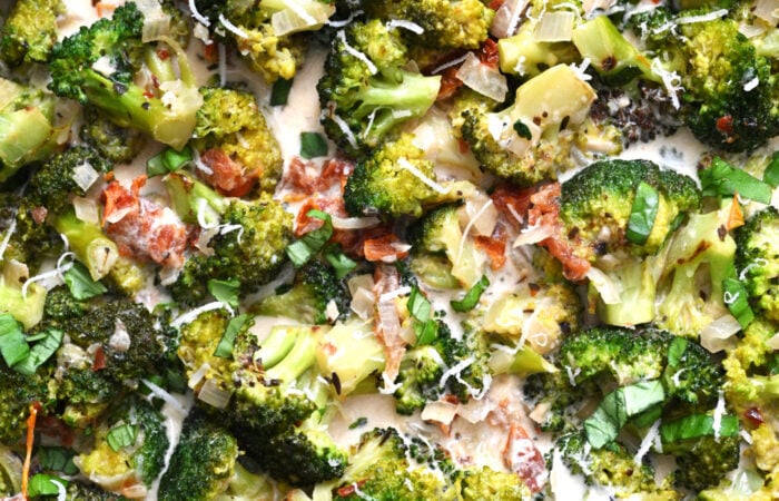 Cooking the broccoli on the stovetop ensures that it remains vibrant and crispy-tender while absorbing the decadent and creamy “marry me” sauce. Studded with bits of sun-dried tomato, and topped with Parmesan and fresh basil, it delivers a restaurant-quality side dish with minimal cleanup!