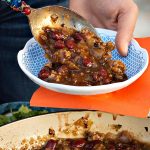 When cooking with beef, I like to soak up the fat by laying a paper towel over the meat and pressing. You may need to do this a couple times. When using Bush’s chili beans, do not strain the beans–mix in the juices and spices.